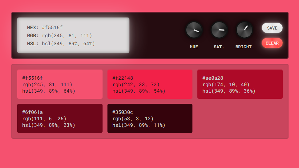 A color tool to quickly find and save colors using hue, saturation and brightness knobs. Build a color palette in minutes—nay, seconds! More features coming soon.